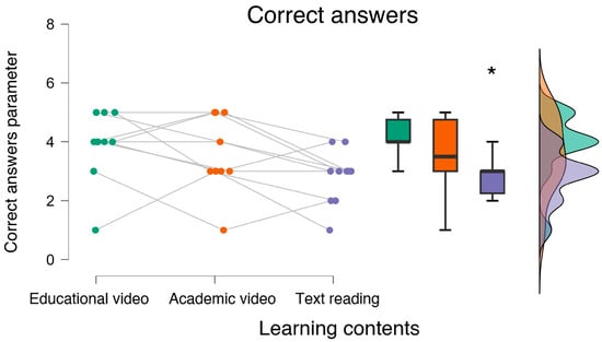 The statistical analysis showed that the participants provided fewer correct answers when accessing the text reading material. * indicates the statistical significance (p < 0.05).