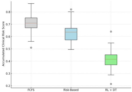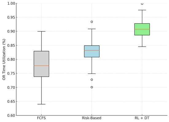 Simulated distribution of OR utilization efficiency by scheduling model. The RL + DT model achieves higher and more stable efficiency. Outliers are displayed as individual points.