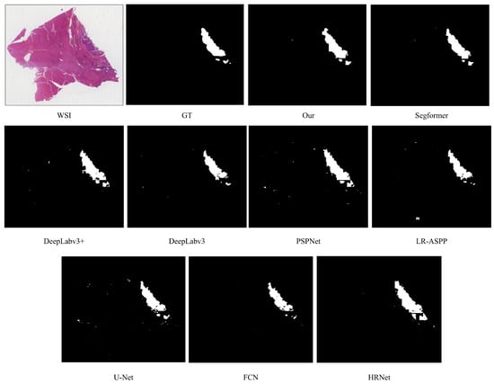 We selected a WSI from the test set with dimensions of 18,000 × 15,360 for visual representation of results. The predicted patches were stitched together to form a complete WSI. The first image in the top row displays the original image, and the second image shows the corresponding ground truth label. White areas represent tumor regions (foreground) with pixel values set to 255, while black areas represent non-tumor regions (background) with pixel values set to 0. The following nine images showcase the prediction results of various models (Figure 3).