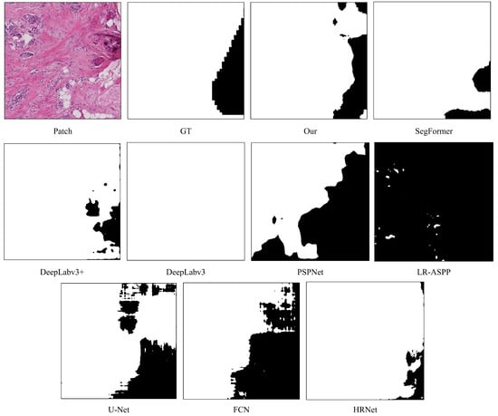 We selected a patch from the test set for visualization. The first image in the top row shows the original image, and the second image displays the corresponding ground truth label. In the label, black areas represent normal tissue and benign lesion regions (background) with pixel values set to 0. White areas represent in situ and invasive carcinoma regions (foreground) with pixel values set to 255. The remaining nine images showcase the prediction results of various models.
