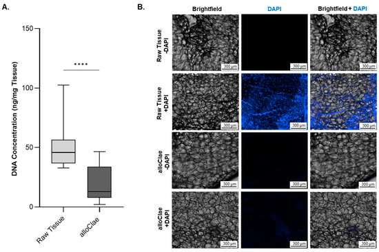 DNA content in raw adipose tissue versus alloClae. (A) DNA levels in raw unprocessed adipose tissue and alloClae. Data represent 7 distinct donors for unprocessed raw adipose tissue and 11 donors for alloClae, of which 5 donors are matched with unprocessed tissue. The results are presented as box whiskers showing the minimum and maximum points. Statistical differences between the raw tissue and alloClae were assessed using Student’s two-tailed unpaired test; **** p < 0.00001. (B) DAPI staining in raw adipose tissue and alloClae (10× magnification) showing nucleic acid content of raw tissue and post-processing. Distinct punctate nuclei can be observed in raw adipose tissue. Scale bar, 300 µm. Representative images of 3 donors.