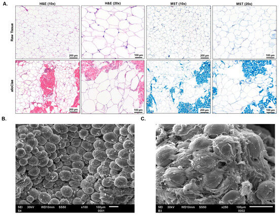Structural analysis of adipose tissue in alloClae. (A) Comparison of the adipose tissue structure before (raw) and after (alloClae) processing. Tissue cross-sections were stained using hematoxylin and eosin (H&E) and Masson’s trichrome (MST) to highlight structural changes post-processing. Images were selected from 15 matched donors, examining at least five fields of view on each histological cross-section. Scale bar, 200 µm (10× magnification) and 100 µm (20× magnification). (B,C) Scanning electron microscopy of alloClae at 100× (B) and 250×. Images were selected from 7 distinct donors. (C) Magnification. Scale bar, 100 µm.