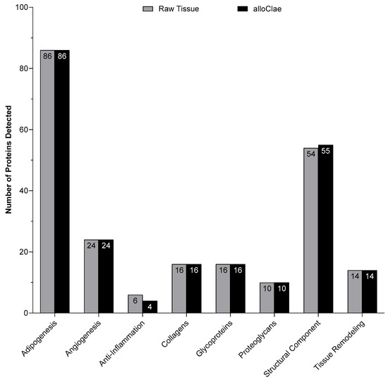 Comparison of the number of proteins detected in each category between matched raw adipose tissue and alloClae.
