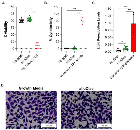 To evaluate alloClae’s biocompatibility and its potential impact on tissue integration, we employed a multiplex approach combining cytotoxicity and cell viability assays to assess the biocompatibility of alloClae in L929 fibroblast cells. The PrestoBlue viability assay, which measures metabolic activity, indicated that cell viability remains unchanged (Figure 6A). Additionally, the lactate dehydrogenase (LDH) assay was performed to assess potential cytotoxicity by comparing the LDH release in alloClae-treated cells to the maximum LDH release observed in Triton X-100-treated L929 cells (positive control). The results indicate that alloClae does not induce cytotoxic effects, as supported by LDH release levels comparable to those of the negative control (Figure 6B). To further evaluate cellular responses to alloClae, we assessed lipid peroxidation levels using the C-11 BODIPY assay. Lipid peroxidation is a marker of oxidative stress that can result in membrane damage and impaired cell function. The results confirm that alloClae does not induce lipid peroxidation, indicating that its presence does not contribute to oxidative stress in L929 cells (Figure 6C). Furthermore, the crystal violet staining assay used to measure viability [51] confirmed no adverse effects on cell density or cell morphology of L929 cells (Figure 6D).