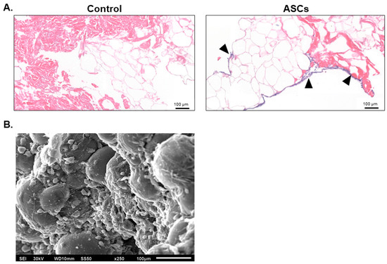 The retention of native ECM proteins is recognized to provide a stable structural framework for cellular adhesion, migration, and proliferation [24,36]. Following confirmation of alloClae’s biocompatibility, we investigated the graft’s capacity to support cell attachment, focusing on human adipose-derived stem cells (ASCs), which are well-known for their multipotent properties [43]. ASCs were seeded onto alloClae grafts for three days under in vivo culture conditions; after three days, alloClae was fixed and stained with H&E or processed for SEM. H&E staining and SEM scans revealed ASC attachment at the periphery of alloClae (Figure 7). These results indicate that alloClae supports ASC attachment. Further, alloClae was compared to a commercially available dAA, a commonly used adipose tissue graft obtained through different decellularization processing methods. In this comparison study, the results suggest alloClae displays comparable levels of ASC attachment (Supplementary Figure S1). Notably, alloClae achieves this without undergoing a complete decellularization process.
