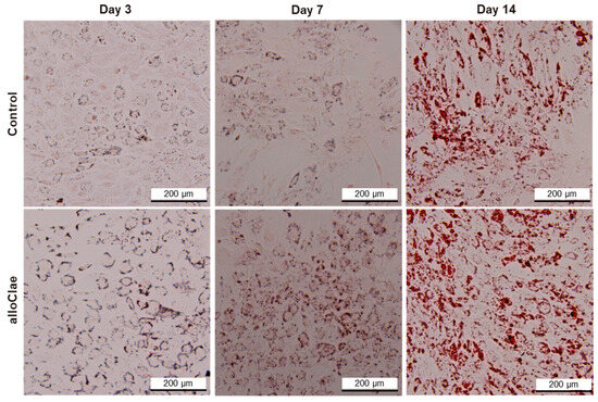 A key objective in adipose tissue engineering is to ensure that host cells not only attach and survive, but also differentiate into mature adipocytes capable of replacing graft fat cells. To determine whether alloClae provides a conducive environment for stem cell differentiation, ASCs were cultured in the presence of alloClae under adipogenic conditions over 14 days. Oil Red O staining was employed to detect lipid droplets, a hallmark of adipogenic differentiation. Morphological changes indicative of differentiation are observed as early as on day 3 in cells treated with alloClae. By this time, faint lipid droplet formation is detected in both control and alloClae-treated cells, as indicated by Oil Red O staining, which is weak in the control-treated cells (Figure 8). After 7 days of culture, lipid droplet accumulation became more pronounced in the cells exposed to alloClae compared to the control-treated cells. By day 14, cells treated with alloClae predominantly differentiate into cells characterized by a significant lipid droplet accumulation, as determined by Oil Red O staining (Figure 8).