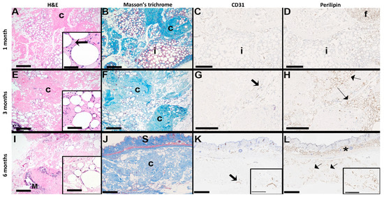 Histopathological assessment of alloClae transplants in athymic mice. Histology scans of H&E, Masson’s trichrome, mouse reactive anti-perilipin, and mouse specific anti-CD31 stains of an alloClae adipose tissue graft transplanted subcutaneously in athymic mice. The arrow in the inset for (A) denotes a foamy macrophage; c = collagen (blue on Masson’s trichrome); f = mouse adipose tissue in the upper right corner of (D); adipocytes within the implant (i) do not label for perilipin. In (G,K), thick arrows indicate positively stained vessels. In (I), M = focus of mineralization. In (H,L), thin arrows indicate positively stained adipocytes. (J–L) Orientation of the implant in relation to the mouse skin (S). The asterisk in (L) shows the normal subcutaneous fat. (A,B,E,F,H–L) Bar = 500 µm. Inset (A), bar = 50 µm; inset (E,I), bar = 100 µm; (C,D,G) bar = 250 µm; inset (J,K), bar = 250 µm.