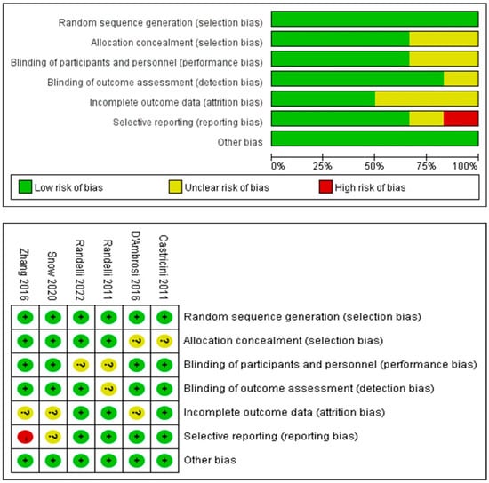 - Higgins, J.P.T.; Altman, D.G.; Gøtzsche, P.C.; Jüni, P.; Moher, D.; Oxman, A.D.; Savovic, J.; Schulz, K.F.; Weeks, L.; Sterne, J.A.C. The Cochrane Collaboration’s tool for assessing risk of bias in randomised trials. BMJ 2011, 343, d5928. [Google Scholar] [CrossRef]