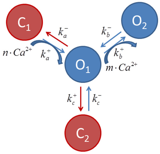 Scheme describing transition among ryanodine receptor states, where and are transition rates, and m and n are the cooperativity parameters of the Ca2+ binding determined experimentally [28]. The transitions C1 ↔ O1 ↔ O2 (curved blue arrows) are Ca2+ dependent. It is considered that most channels are in the C1 state at diastolic [Ca2+]i.