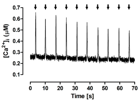 Typical Ca2+ transients evoked by brief (60 ms) caffeine pulses (arrows) in the experimental FISRM.