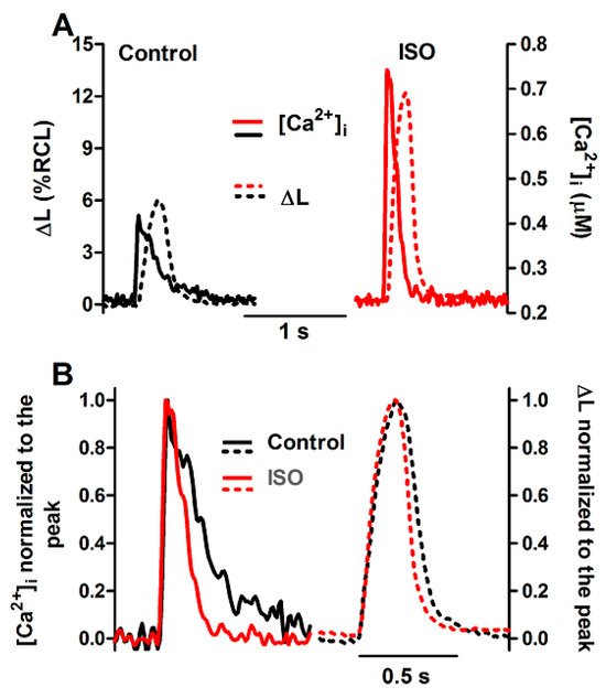 Ca2+ transients and twitch contractions recorded simultaneously at 0.5 Hz from a rat ventricular cardiomyocyte before (control) and after addition of isoproterenol (ISO, 10 nM). (A): Systolic cell shortening (ΔL, expressed as percent of resting cell length, RCL) and cytosolic Ca2+ concentration ([Ca2+]i). (B): the same traces after normalization to the respective peak value.