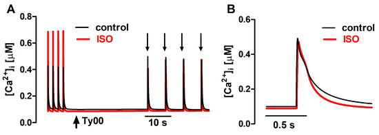 In this case, by setting and ms in the absence of caffeine, and and during the first 20 ms of the caffeine pulse, a bell-shaped curve for with duration similar to of the whole caffeine pulse is obtained, in analogy to that obtained by Bondarenko et al. [16] under electrical pacing. During exposure to ISO and tBQ, was adjusted to 0.15 and 0.40, respectively. For more details, see the Supplementary Materials, in which a schematic representation of the mathematical FISRM is shown (Figure S1).