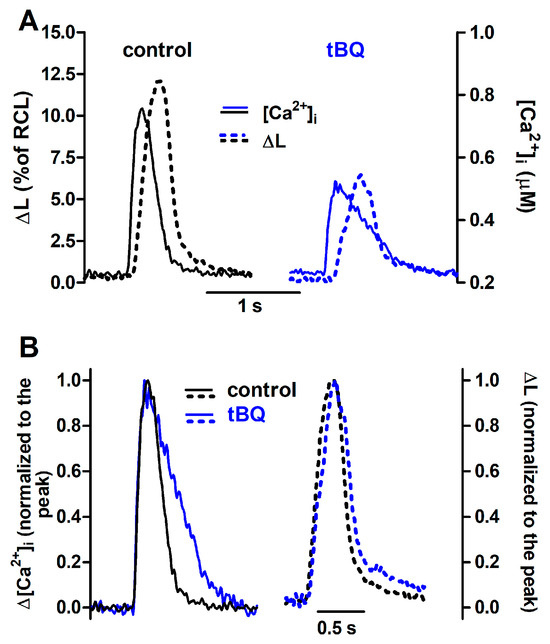 Ca2+ transients and twitch contractions recorded simultaneously from a rat ventricular cardiomyocyte before (control) and after addition of 2,5-di-(tert-butyl)-1,4-benzohydroquinone (tBQ, 5 μM). (A): Systolic cell shortening (ΔL, expressed as percent of resting cell length, RCL) and cytosolic Ca2+ concentration ([Ca2+]i). (B): the same traces after normalization to the respective peak value.