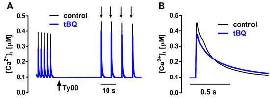 SERCA inhibition by tBQ, on the other hand, was simulated by diminishing the maximal Ca2+ uptake capacity, equivalent to a decrease in the number of active enzyme molecules, based on the observation that tBQ binds to the ATPase, forming a dead-end complex with interruption of the Ca2+ transport cycling [24,40]. In the experimental model, tBQ effects were on average stronger on amplitude of electrically stimulated twitches than of caffeine-induced transients, which was not reproduced by the simulations, in which a milder and comparable depression of Δ[Ca2+]i was observed in both kinds of transient. It is likely that these discrepancies are related to the inhibition of L-type Ca2+ current by this agent at concentrations required for SERCA inhibition [25], which was eliminated by extracellular Ca2+ removal and not included in the computational model as one of the mechanisms affected by tBQ.