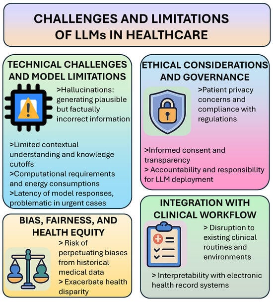 - Busch, F.; Hoffmann, L.; Rueger, C.; van Dijk, E.H.; Kader, R.; Ortiz-Prado, E.; Makowski, M.R.; Saba, L.; Hadamitzky, M.; Kather, J.N.; et al. Current applications and challenges in large language models for patient care: A systematic review. Commun. Med. 2025, 5, 26. [Google Scholar] [CrossRef]