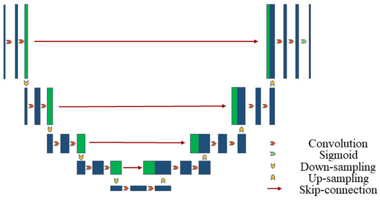 U-Net is a convolutional neural network structure for image segmentation, consisting of an encoder for feature extraction and a decoder for generating segmentation results [43]. Below is the mathematical representation of the basic U-Net structure in Figure 1.