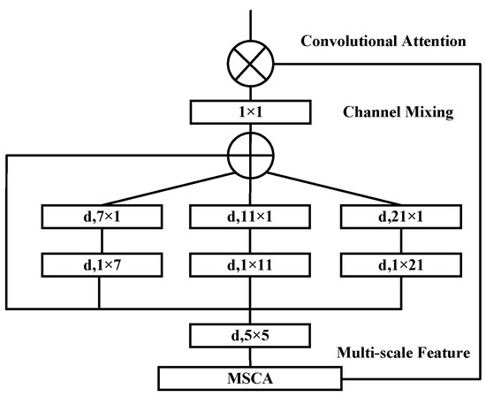 The MSCA mechanism adopts a pyramid-like structure and comprises three key components: depth-wise convolutions for local information extraction; multi-branch separable depth-wise convolutions to capture features at multiple scales; and a 1 × 1 convolution to model inter-channel relationships. The output of the 1 × 1 convolution serves as the attention weight, which is used to reweight the input features, thereby producing the refined output of the MSCA module. The detailed structure is illustrated in Figure 2.