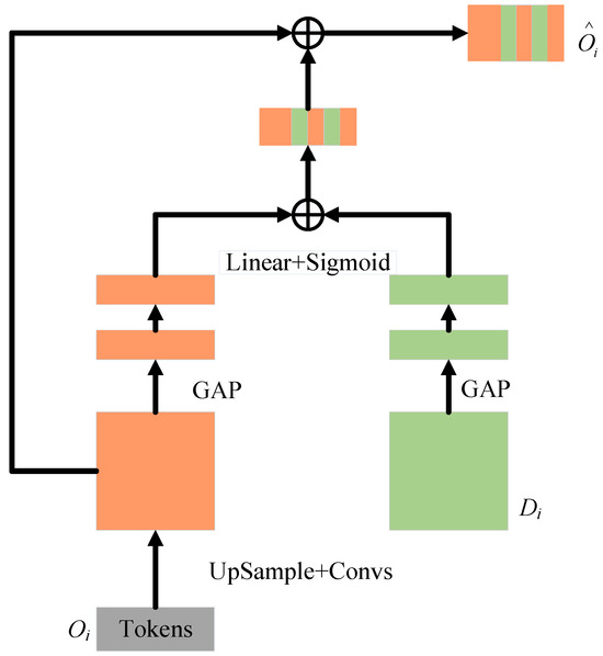 where and represent the weights of two Linear layers and the ReLU operator . The formula encodes channel dependencies. As indicated by ECA-Net, avoiding dimension reduction is crucial for learning channel attention [50]. A single Linear layer and sigmoid function construct the channel attention map. The resulting vector recalibrates or activates to , where denotes channel importance. Finally, the masked is concatenated with the upsampled features of the decoder level.