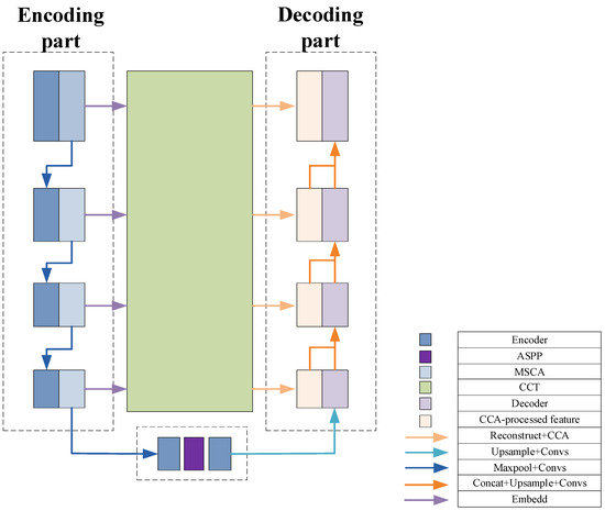 where MSCA is the multi-scale convolutional attention mechanism; ASPP is the atrous spatial pyramid pooling; CCA is the Channel-wise Cross-Attention module; and CCT is the module for Channel-wise Cross Fusion Transformer. represents the encoder layer and the bottleneck layer, and represents the decoder layer.