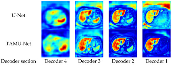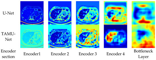 TAMU-Net demonstrates significant advantages in liver image segmentation compared to the other six models, effectively avoiding over-segmentation and under-segmentation. For small regions, TAMU-Net can identify and segment details that are difficult to discern by the human eye, showcasing its outstanding segmentation performance. For discontinuous regions, TAMU-Net accurately identifies and segments areas with irregular shapes and positions, demonstrating its adaptability to complex shapes and discontinuous locations. Furthermore, for larger regions, TAMU-Net can identify and segment areas with relatively regular shapes and positions, yet potentially complex backgrounds, highlighting its capability in handling large regions and complex backgrounds. TAMU-Net’s superiority lies in three key aspects: (1) the new model incorporates the MSCA module in the encoder, enhancing the feature extraction ability; (2) the Channel Transformer module replaces the original skip connections, strengthening effective feature interaction, reducing the semantic gap, and promoting the fusion of deep and shallow features; (3) the ASPP structure strengthens the acquisition of global contextual information.