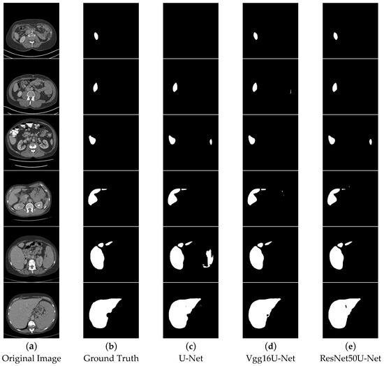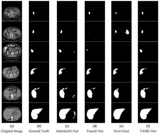 In the segmentation comparison images, panels a and b in Figure 11 and Figure 12 represent the original CT image and the ground truth, respectively. Panels c, d, and e in Figure 11 show the results of the U-Net, Vgg16U-Net, and ResNet50U-Net models, while c, d, and e in Figure 12 represent the results of the AttentionU-Net, TransU-Net, and Swin-Unet models. Panel f in Figure 12 shows the result of the proposed model, TAMU-Net. The first three rows of segmentation images correspond to small liver regions, the fourth and fifth rows show discontinuous liver regions, and the last row represents larger liver regions. Detailed results are presented in Figure 11 and Figure 12.