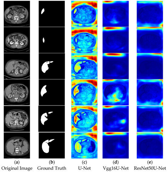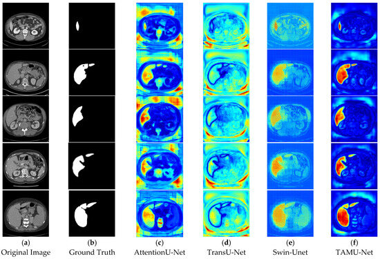 In the segmentation comparison heatmaps, panels a and b in Figure 13 and Figure 14 represent the original CT image and the ground truth, which serves as the reference for evaluating model performance. Panels c, d, and e in Figure 13 represent the U-Net, Vgg16U-Net, and ResNet50U-Net models, respectively, while Panels c, d, and e in Figure 14 show the AttentionU-Net, TransU-Net, and Swin-Unet models. Panel f in Figure 14 shows the result of the proposed TAMU-Net model. The results represent the segmentation heatmaps of the final layer of the decoder. Detailed results are shown in Figure 13 and Figure 14.