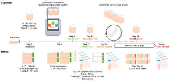 A schematic overview of the automated and manual production of 2.5 × 1010 suspension cells. This schematic illustrates key procedural differences between manual and automated cell expansion workflows. The automated process (top) leverages the Quantum Cell Expansion System. It begins with the inoculation of 5 × 107 cells, followed by continuous automated expansion with intermittent harvests every 3 to 4 days. The automated process reaches the targeted cumulative cell dose of 2.5 × 1010 with the final harvest on day 29. In the manual process (bottom), cell expansion is initiated by inoculating 4 × T175 flasks with a total of 2.4 × 107 cells. On day 3, the accumulated cells are transferred into a total of 33 × T175 flasks, with a defined cell density of 6 × 106 cells in 30 mL media per flask. This is followed by harvesting the cells and inoculating 33 new flasks for continuous expansion, a step that is repeated every 4 days, reaching the targeted dose of 2.5 × 1010 with the harvest on day 41.