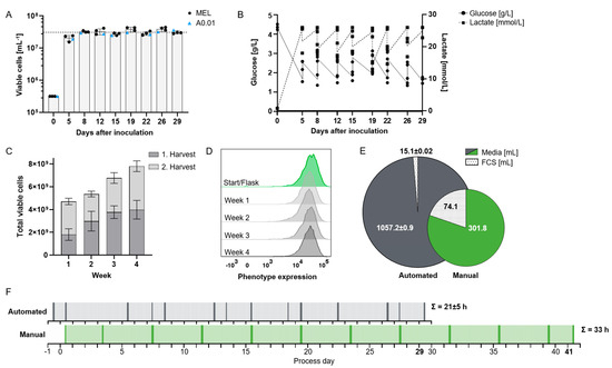 Establishment of automated feeding protocol for high-yield production of suspension cell lines. (A) Viable cell concentration at harvest for two suspension cell lines, MEL (n = 3; used for establishing the expansion protocol) and A0.01 (n = 1). Mean of peak concentration 31 × 106 cells/mL (dotted line). (B) Glucose and lactate concentrations at harvest and after re-suspension of residual post-harvest MEL cells (n = 3). (C) Cumulative viable cell yield over four weeks, with two harvests per week of both cell lines (n = 4). (D) Flow cytometric assessment of transgenic expression of a surface molecule as representative marker of phenotypic stability during expansion in bioreactor for MEL cells. (E) Consumption of media and fetal calf serum (FCS) normalized to production of 1 × 109 cells comparing automated (n = 3) and manual process. (F) Timeline for producing 2.5 × 1010 suspension cells using automated (top) (n = 3) vs. manual (bottom) processes. Labor is shown in 30 min increments: hands-on time (dark), unobserved work (light). Cumulative hands-on time is indicated for each process.