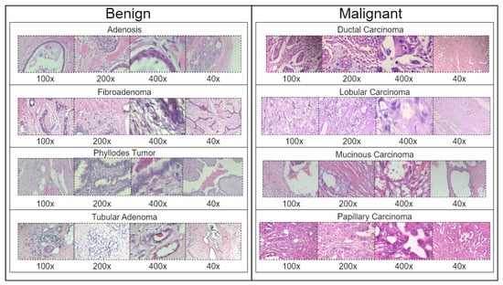 Representative samples from the BreakHis dataset showing benign and malignant breast tissue histopathological images across different magnifications (40×, 100×, 200×, and 400×). The benign samples include Adenosis, Fibroadenoma, Phyllodes Tumor, and Tubular Adenoma, while the malignant samples consist of Ductal Carcinoma, Lobular Carcinoma, Mucinous Carcinoma, and Papillary Carcinoma.
