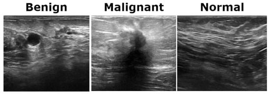 Representative ultrasound images from the BUSI dataset showcasing three classes.