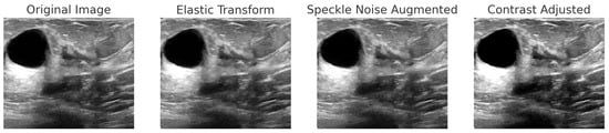 Step-by-step augmentation of a BUSI dataset sample. The original ultrasound image undergoes three transformations: (1) Elastic Transform to introduce slight deformations; (2) Speckle Noise Augmentation to simulate real-world noise variations; (3) Contrast Adjustment to enhance intensity variations.