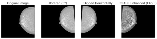 Data augmentation techniques applied to a mammogram image from the INbreast dataset: original, rotated (+5°), horizontally flipped and CLAHE.