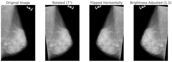 Data augmentation techniques applied to a mammogram image from the CBIS-DDSM dataset: original, rotated (+7°), horizontally flipped, and brightness-adjusted.