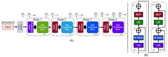 Architecture of the Swin Transformer. (A) The hierarchical model structure takes a 224 × 224 × 3 input image, applies patch partitioning and linear embedding, and processes it through four stages with Swin Transformer blocks. Patch merging reduces spatial dimensions and increases feature depth across stages. (B) Structure of a Swin Transformer block showing two sub-blocks. Each includes Layer Normalization (LN), Window-based Multi-Head Self-Attention (W-MSA), and a MLP, with residual connections after W-MSA and MLP.