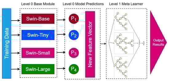 Proposed BreastSwinFedNetX model architecture for multi-class classification. The Level 0 Base Module includes four Swin Transformer variants that generate predictions. These predictions form a New Feature Vector passed to the Level 1 Meta Learner, which produces the final results.