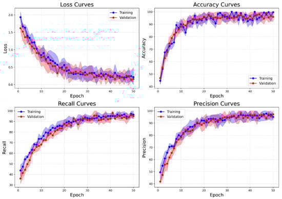 Learning curves of BreastSwinFedNetX model on highest performing multiclass classification dataset.