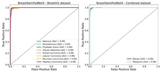 ROC AUC curves of BreastSwinFedNetX model on highest performing multiclass and binary classification dataset.
