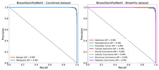 Precision recall curves of BreastSwinFedNetX model on highest performing binary and multiclass classification dataset.