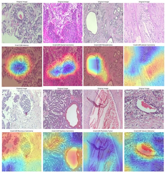 Grad-CAM visualizations on the BreakHis dataset, illustrating model attention in breast cancer classification. Warmer colors (red/yellow) indicate regions of high activation, highlighting critical features used in decision-making.