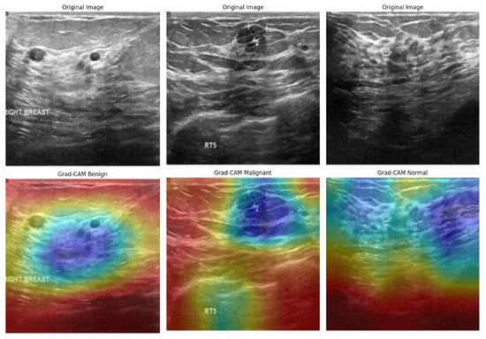 Grad-CAM visualizations of BUSI dataset images, highlighting model focus areas for benign, malignant, and normal cases.