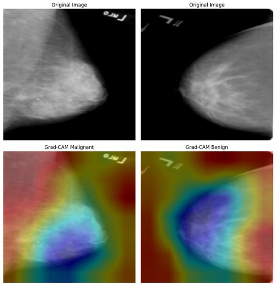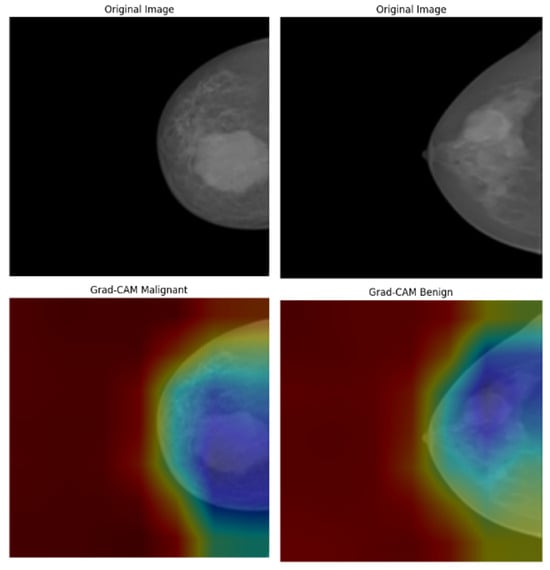 Grad-CAM visualizations of malignant and benign cases from the CBIS-DDSM dataset.
