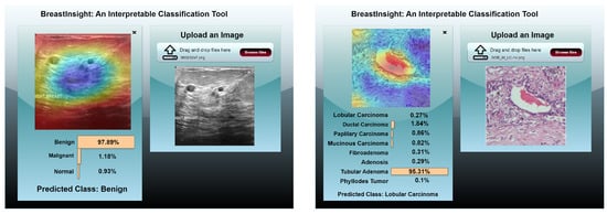 BreastInsight user interface during inference. The clinicians upload an image and the global BreastSwinFedNetX model takes in the subsequently processed image. Class probabilities for each instance are displayed in the form of horizontal bars.