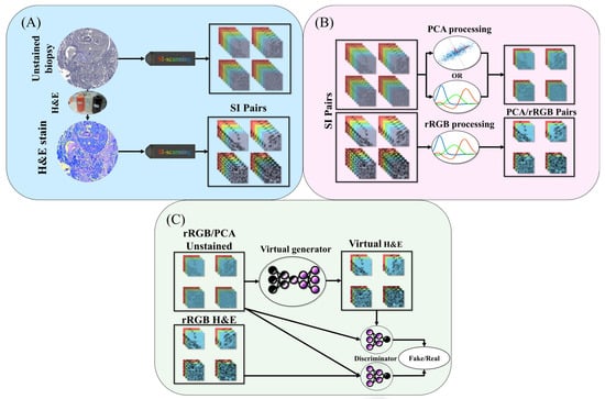 In this study, we propose a framework for virtual H&E staining using spectral data from unstained human biopsy samples followed by AI analysis (Figure 1). We used breast cancer biopsy samples that were scanned by our SI system twice, first without any stain, and again following standard H&E staining protocol (Figure 1A). The spectral images of the stained dataset went through a process of reduction to Red–Green–Blue (rRGB) based on the CIE 1931 scheme [17]. The unstained dataset was also reduced to rRGB (Figure 1B), but in addition, it was reduced by Principal Component Analysis (PCA) [18]. In contrast to previous works on virtual H&E staining, we did not make use of autofluorescence [5,19] in the invisible range; instead, we measured only the bright-field transmission in the visible spectral range. This is simpler and faster in comparison to fluorescence measurements, and yet, we achieved high performance, emphasizing the applicability of spectral information.