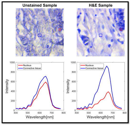 Example of nuclei and connective tissue spectra from images of an unstained sample (left) and an H&E-stained sample (right). Note that the unstained tissue is highly transparent and reveals very few details. To improve its visibility, we applied a color enhancement that renders the image bluish and somewhat artificial appearance, while emphasizing the spatial details of the tissue. The bottom graphs show the average transmission spectra from the blue and red squares shown in the images. The images area is as measured with a 20× magnification.