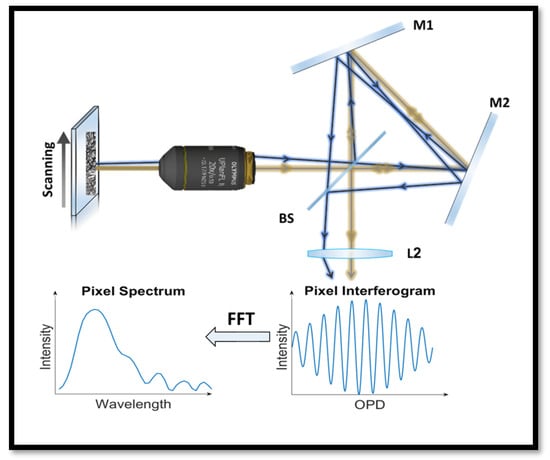 Lately we developed a spectral imaging system based on Fourier spectroscopy [14], that measures the spectrum indirectly by measuring an interference pattern known as the interferogram for each pixel (Figure 3). Each interferogram, captured for each pixel in the image, represents intensity as a function of optical path difference (OPD) generated by a Sagnac interferometer. These interferograms are collected simultaneously for all the pixels in the image (Figure 3). The system has no moving parts, except for a microscope computer-controlled stage that is needed for scanning the sample anyway, similarly to WSI systems [29].