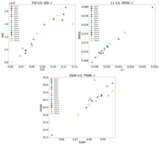 The six metrics for all types of datasets are displayed across three different scatter plots. All dataset methods achieved similar results in the spatial metrics, including L1, RMSE, PNSR, and SSI, with a small advantage for PCA-10 and PCA-11. However, the evaluation of the results using statistical measures (FID and KID) shows a clear advantage for PCA-5. Arrows on the figure titles indicate the direction of better results.