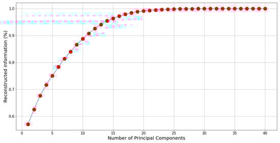 Reconstruction information of 1-Loss(n) as a function of the number of components. Notably, the first component captures over 50% of the total information, while the first 5 components account for 75% of the information.