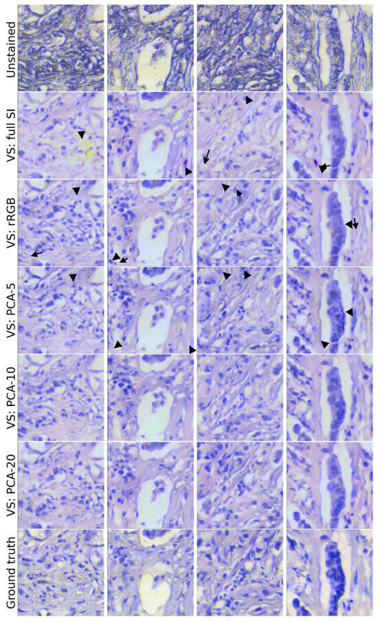 Examples of images reconstructed from unstained tissues using different models. The reconstructions based on full SI and rRGB exhibited higher noise levels and reduced effectiveness in identifying nuclei compared to results obtained using PCA. In addition, the VS method presented a cleaner result than the GT method. Each image is size is as measured with a 20 × magnification. The black arrows indicate inaccuracies of the full SI- and rRGB-based models compared to the PCA-5 based model.