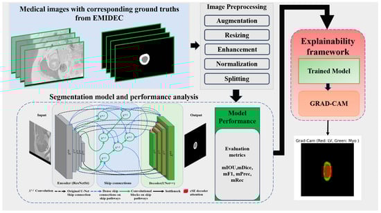 Our methodological framework, depicted in Figure 1, presents a comprehensive pipeline for medical image segmentation and interpretability. The process begins with EMIDEC images and their corresponding ground truth annotations. These images undergo a series of pre-processing steps, including data augmentation, resizing, contrast enhancement, normalization, and dataset partitioning. The pre-processed data are then fed into a segmentation network that integrates a ResNeSt-based encoder with a Unet++ decoder enhanced by channel squeeze and excitation (cSE) attention mechanism to train and perform semantic segmentation of three classes: background (BG), LV, and Myo. Model performance is quantitatively assessed using standard evaluation metrics such as mIoU, mDice, mF1–score, mPrecision, and mRecall. To enhance model interpretability, a Grad-CAM-based explainability framework is employed, enabling the visualization of class-specific feature activations in the segmented outputs.