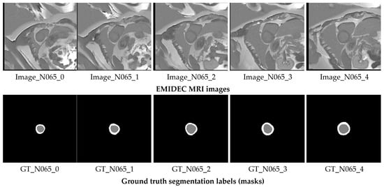 EMIDEC 2020 is a new publicly available DE-MRI database (https://emidec.com/, accessed on 3 June 2024) including 150 clinical cases, along with relevant clinical information []. The training set consists of 100 cases with ground truth (GT) masks, including 33 normal and 67 pathological cases. The test set comprises 50 cases, 17 normal and 33 pathological, without GT masks. Since the official test set does not provide ground-truth annotations, it cannot be used for computing evaluation metrics. To address this, we re-partitioned the labeled training data into new training, validation, and test subsets to ensure a fair and measurable assessment of model performance. The original test set, lacking ground truth, was instead utilized for supplementary visual analysis as part of an additional qualitative validation study to further demonstrate the model’s practical applicability. This dataset has been demonstrated to be capable of being utilized to develop methodologies to automatically classify various relevant regions (LV—left ventricular, Myo—myocardium, MI—myocardial infarction, and MVO-persistent microvascular obstruction) from a series of short-axis DE-MRIs covering LV and then quantify MI estimates in absolute value (mm3) or as a percentage of the myocardium []. The quantity of images varies for each patient, from 5 to 10 short slices encompassing the left ventricle (LV) area. Expertly drawn segmentation labels for these regions were provided for each MRI slice. Figure 2 illustrates an instance of the original short-axis MRI series alongside their respective GT annotations for an N065 normal patient.